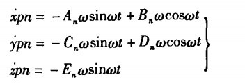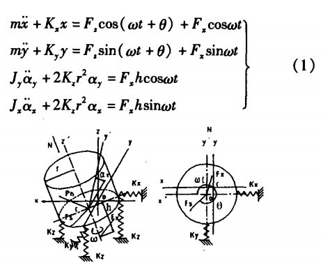 在一定條件下 , 旋振篩可以簡化為一個六 自由度的無阻尼線性強迫振動模型。如果再適當地選擇坐標系( 圖 I ) , 則可以獲得如下解耦的運動微分方程組,式中: